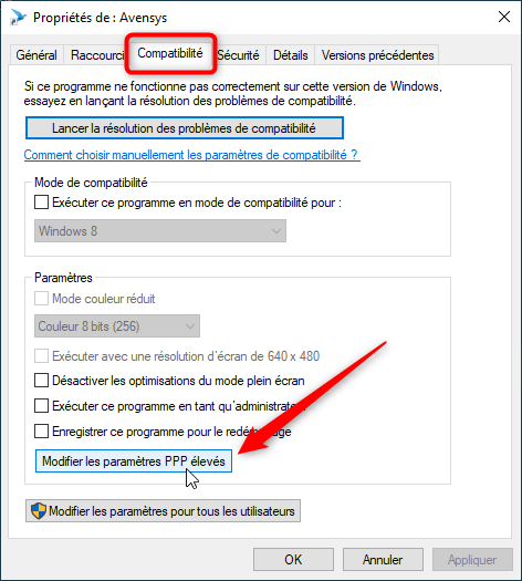 Clic droit sur le raccourci Avensys > Propriétés > puis onglet Compatibilité > Modifier les paramètres PPP élevés :