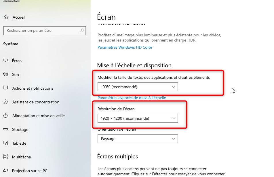 Vous pouvez également jouer avec la mise à l'échelle de votre poste, dans les paramètres d'affichage et ajuster la mise à l'échelle et la résolution d'écran (généralement il vaut mieux être à 100%) :