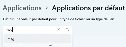 Une fois sur la page des programmes par défaut, en haut saisissez "eml" puis cliquez sur la proposition qui apparaît (.eml). Faites de même avec l'extension "msg":